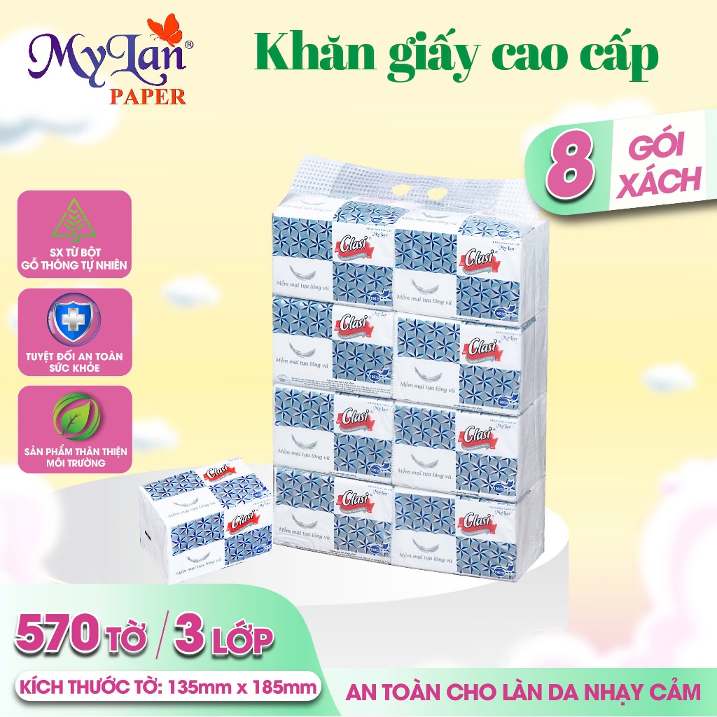 Khăn Giấy Rút Mylan Kim Cương 3 Lớp Giấy Ăn Cao Cấp 8 Gói/Lốc Mềm Dai Không Bụi Giấy Thấm Hút Tốt (Combo 2 Lốc)