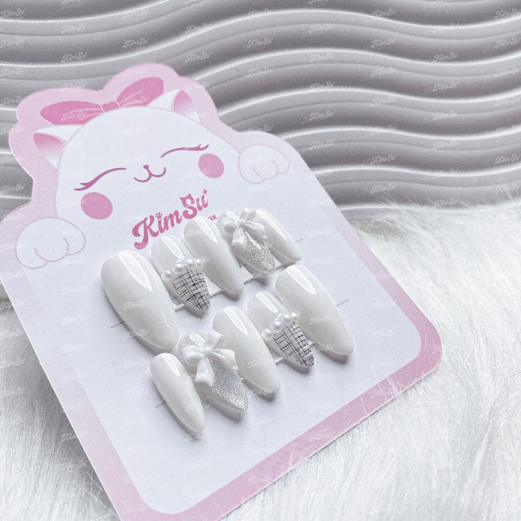 [M069] KimSu Nailbox trắng mắt mèo kẻ dạ đính nơ