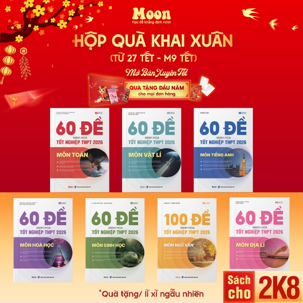 Sách bộ đề minh hoạ ôn thi THPT 2026 môn Toán, Lý, Hoá, Sinh, Anh, Văn, Sử, Địa Moonbook