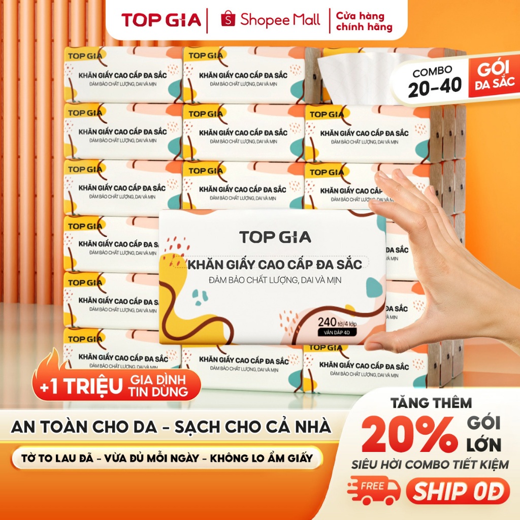 [SIÊU TIẾT KIỆM] Giấy ăn rút Topgia đa sắc cao cấp 240 tờ 4 lớp, dập vân 4D, mềm mịn, thấm hút tốt