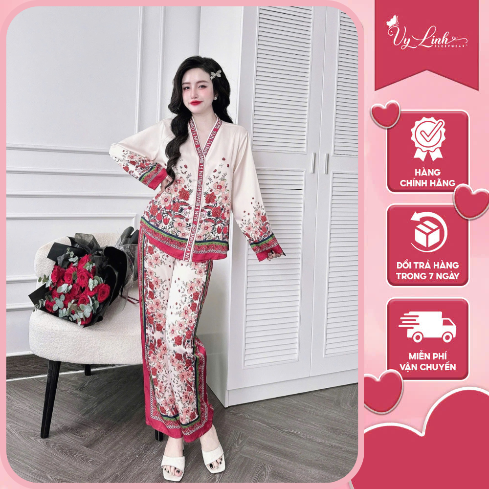 Bộ đồ ngủ cổ Y Vy Linh tay dài chất liệu lụa latin thoáng mát, thấm hút mồ hôi tốt S1081 new
